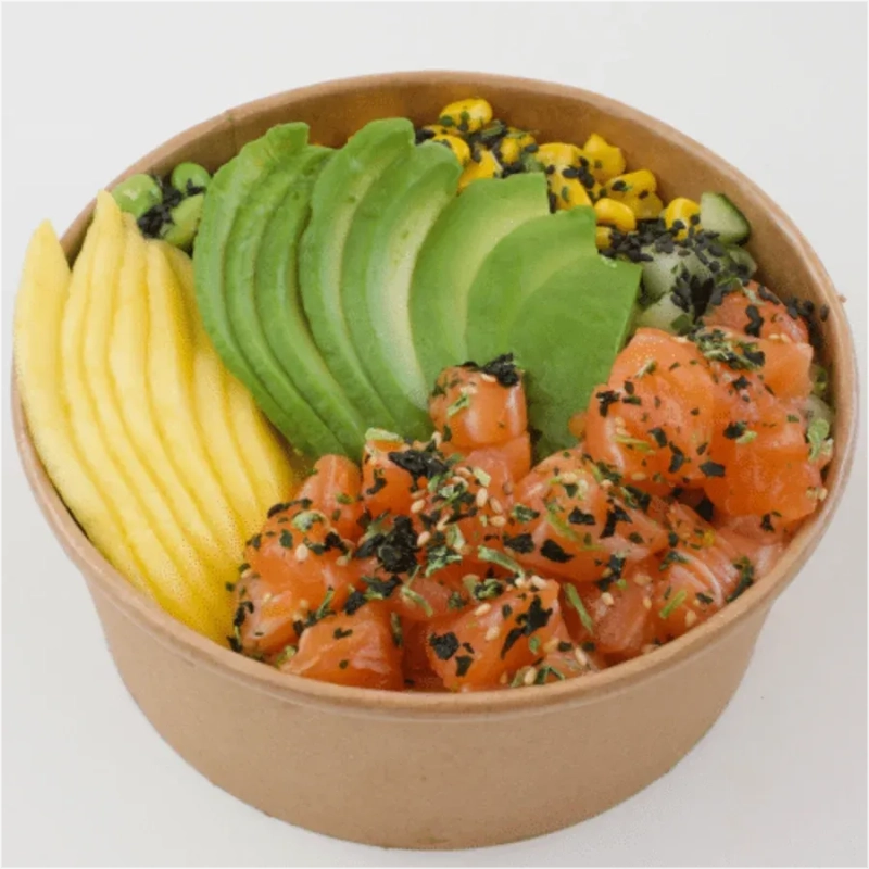 Zalm, maïs, avocado, mango, komkommer, sojabonen, peterselie, sesam dressing, teriyaki, zwart sesamzaadIncl. € 0,10 Wettelijke Milieu Toeslag